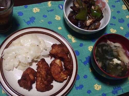 晩御飯の記録 大豆粉でから揚げ ピーマンと茄子とマイタケのオイスターソース炒め ザワークラウト風キャベツ 味噌汁 遅ればせながら昨日の晩御飯の記録です。 大豆粉でから揚げリベンジするべく作ってみました。 いつも作っているから揚げの材料の小麦粉を大…